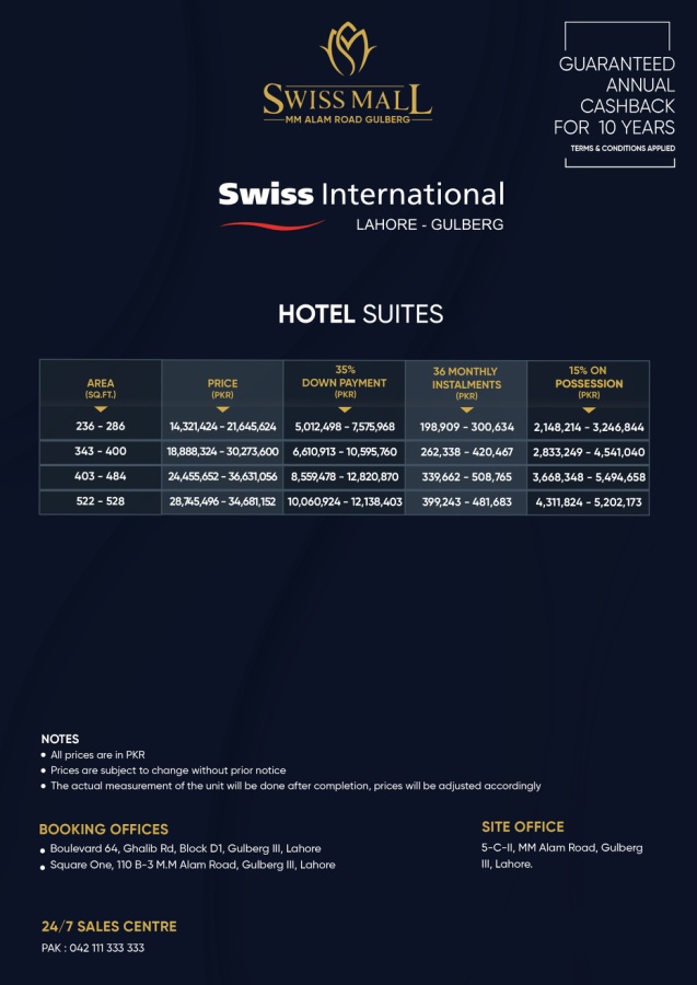 Whether you're investing in a hotel suite operated by a trusted international brand or acquiring retail frontage in one of Lahore’s busiest commercial zones, Swiss Mall delivers unmatched value.